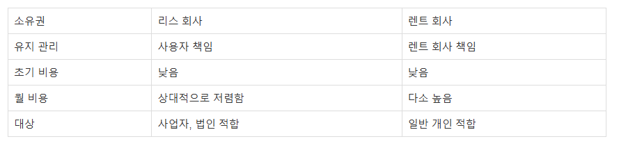 - 비용 비교하기: 월 렌트료 또는 리스료를 비교하고, 추가 비용(유지비, 보험료 등)을 함께 고려하세요.